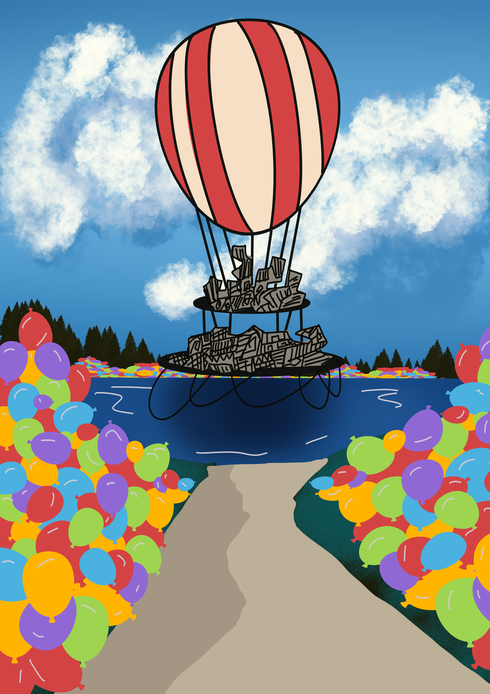In the end, I created an environment of a balloon scrapyard, and in the artwork shown, a hot air balloon floating over a pond contains all the mech robot pieces.