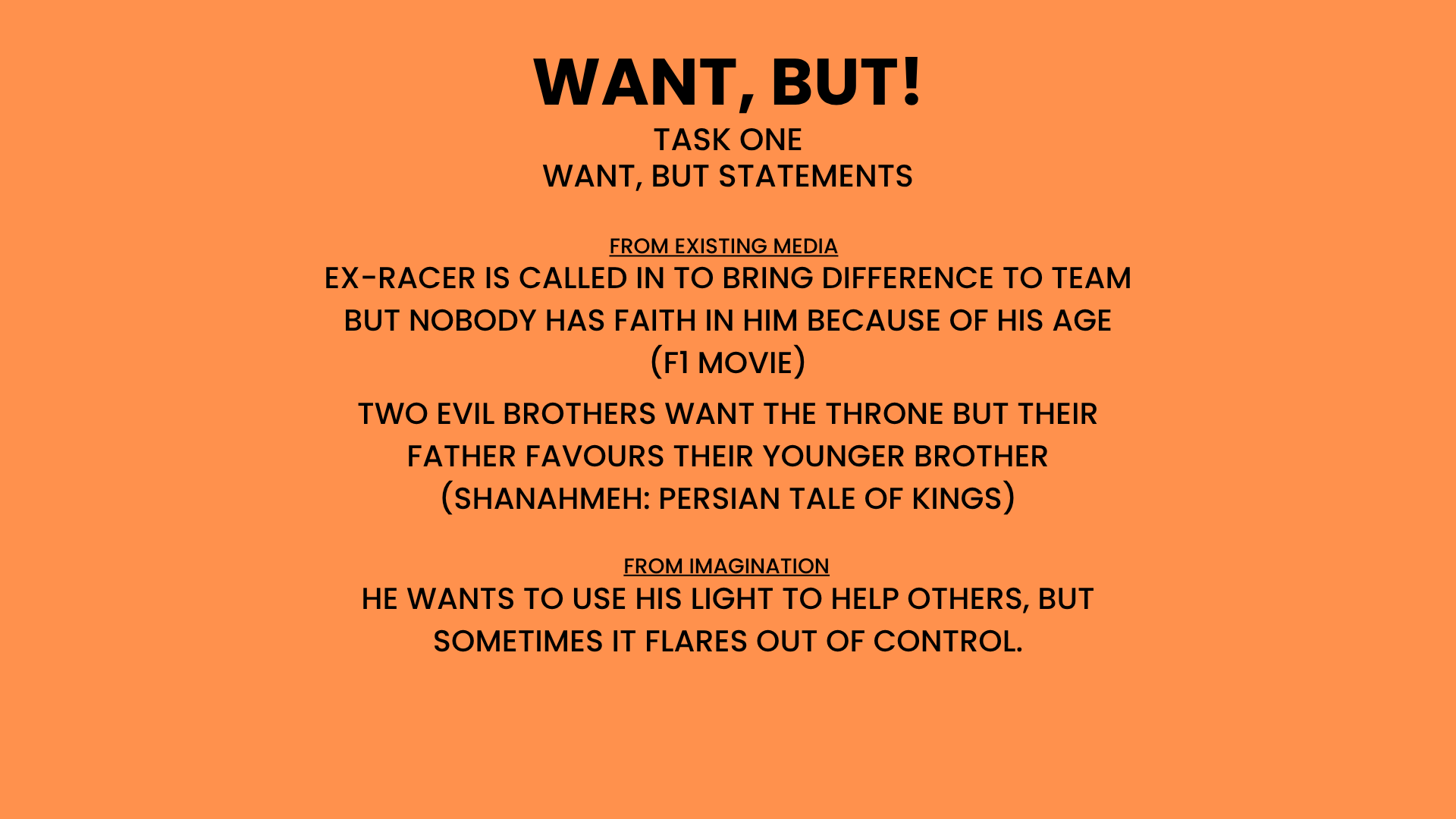 as part of our first task, we were asked to come up with want, but statements, I created two from pop-culture/existing media and one from imagination.. this brings us to our next task.