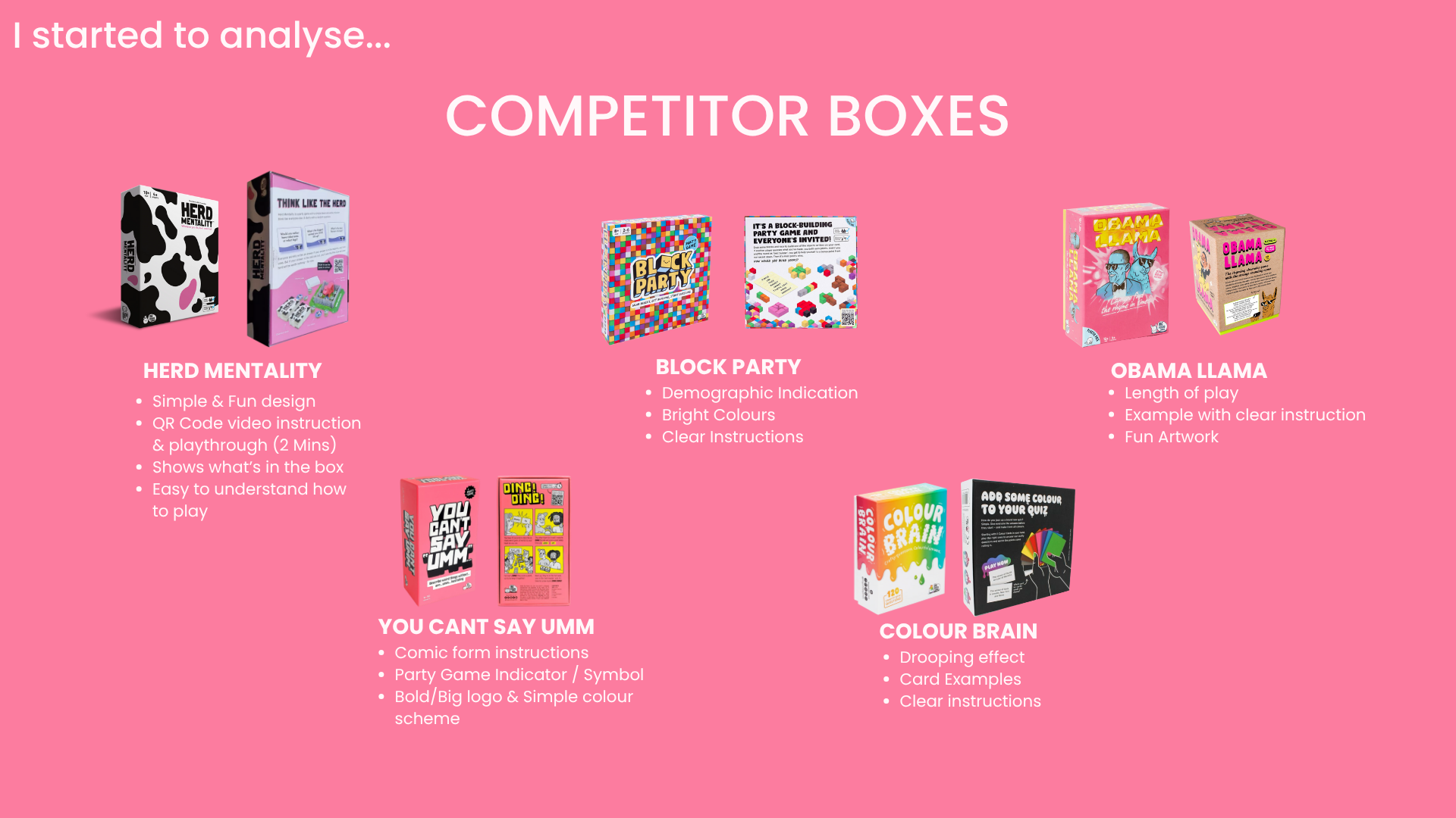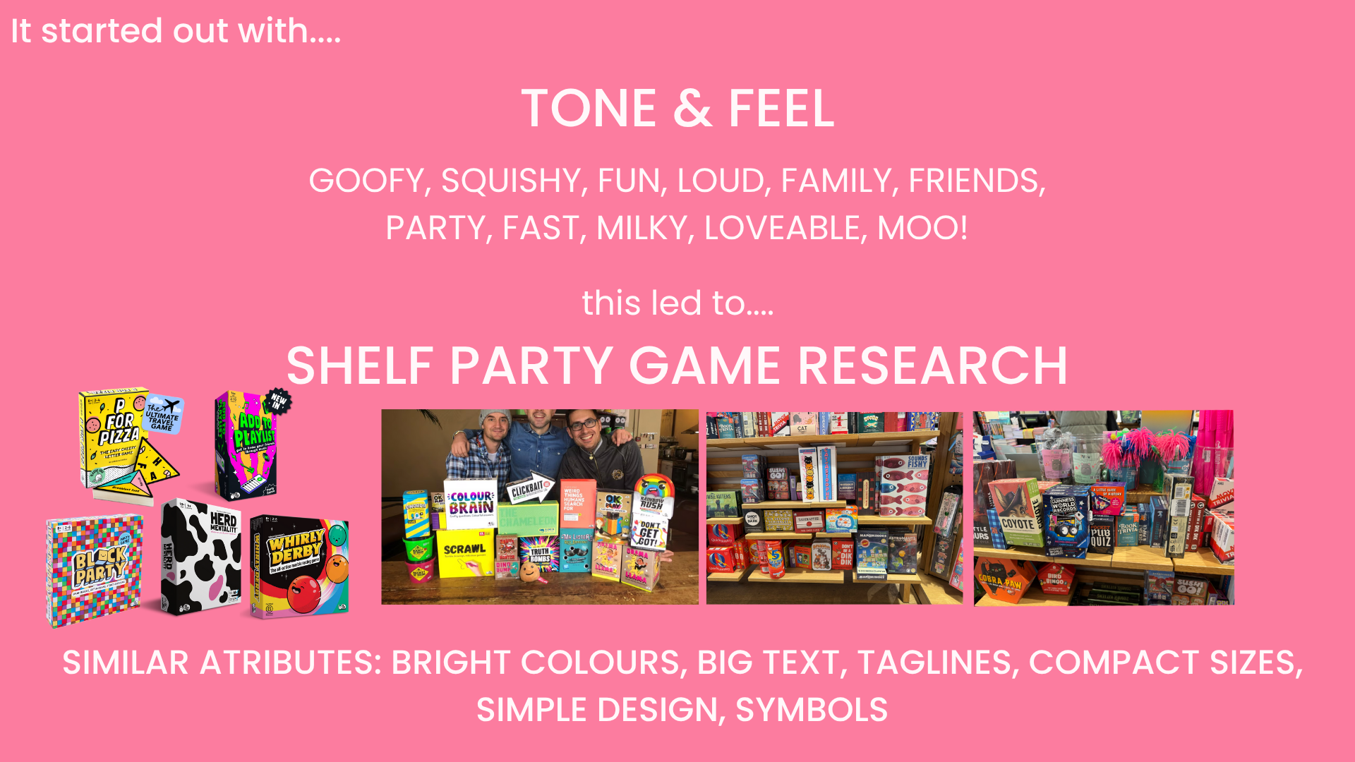 - “Senna - Primary research showed the dedication to the brief and was effective in understanding the current market and the competitors research also shows. Looking at different games helped such as Calligraphy into Artsty really bought out the detail and made it clear where the inspirations came from while communicating the necessary information, especially with the cow theme. In the final, the milk bucket design really stands out but maybe simplify the cow illustration so that the design is respected in the brief and shape should reflect the content of the box better. The first design is interesting, the pink and black colours work but maybe the composition and layout could be refined also. Overall, I think the Typography and tagline might need more refining! to be added. (Jade)”
