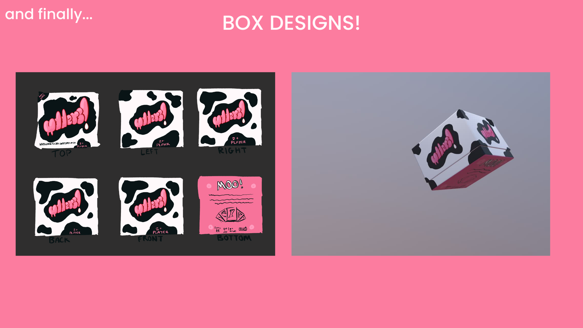 - “Senna - Images and design is overall always super nice, love the compact box, I love the milk bucket idea, it brings it all back to the same kind of theme, I think the concept of the cow illustration is really nice as well, and the QR code is a very fun extra touch. It really makes it stand out (however a round box would be awkward to show and store alongside trying to fit cards inside). for the final the use of the pink is great makes it really stand out, the box with the cards shown and the cow illustration is a great composition too. - grace”