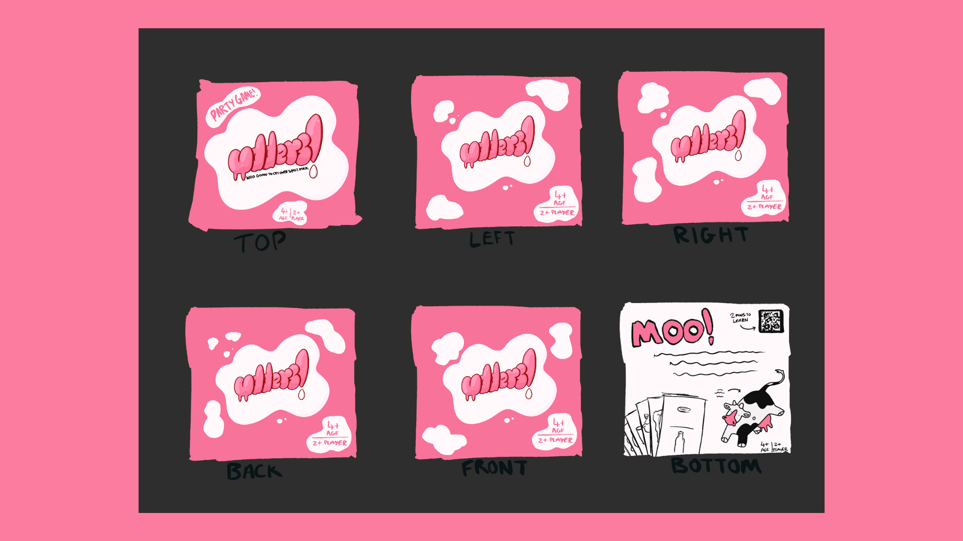 - “Senna - I like how you looked into so many games and took photos of games displays in a store, its really neat how you took things like rule books and onboarding and compared it to other competing animal themed party games too. Box design 1 is simple but effective, I like the slight variants between each sides design. Milk bucket design is fun and I like the overflowing/dripping design. (Abbie)”
