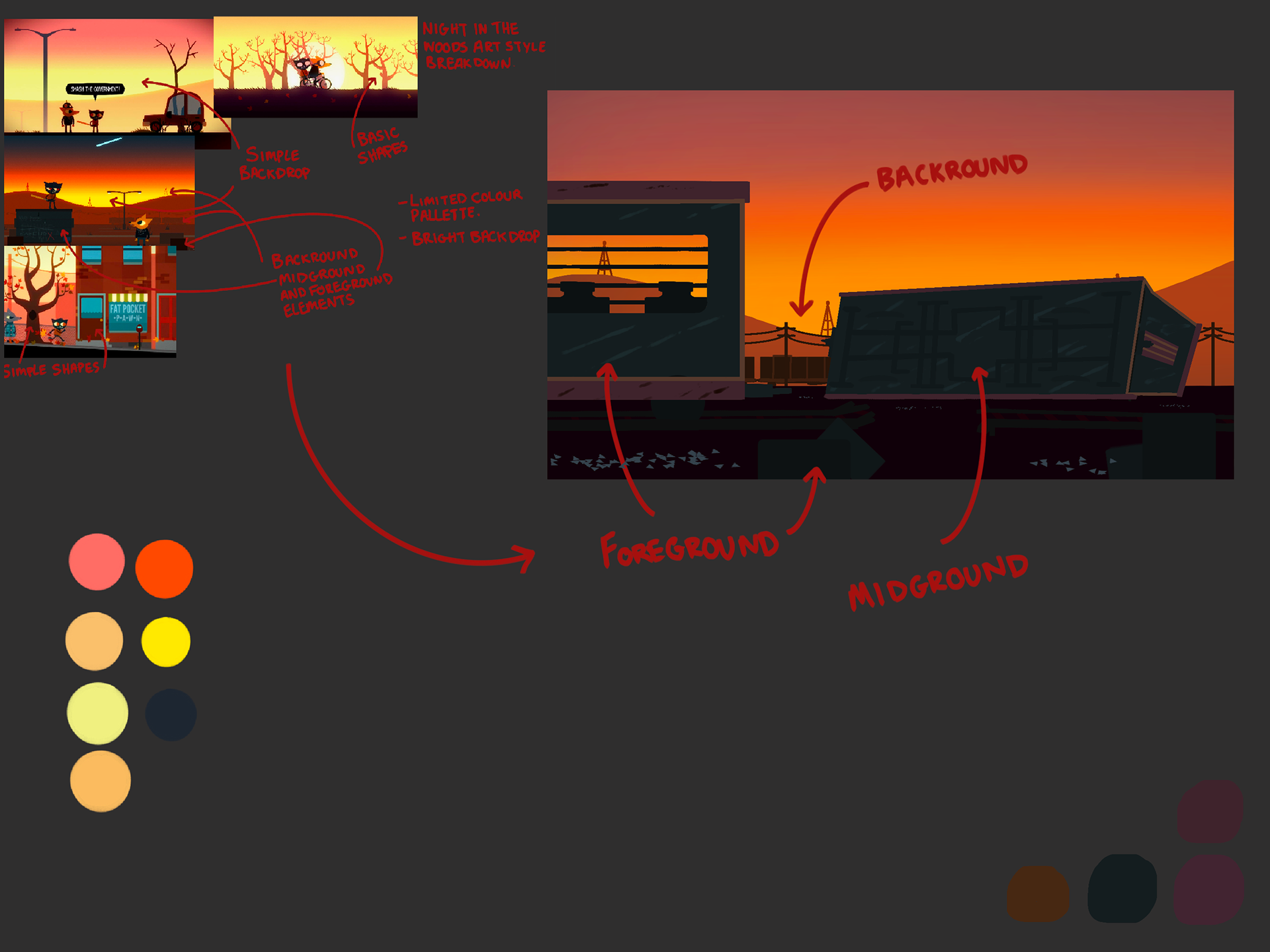 I was quite fond of a simple art style but still one that can be quite impactful, I found joy in looking at a game called Night In the Woods and decided to break down this art style for my level.